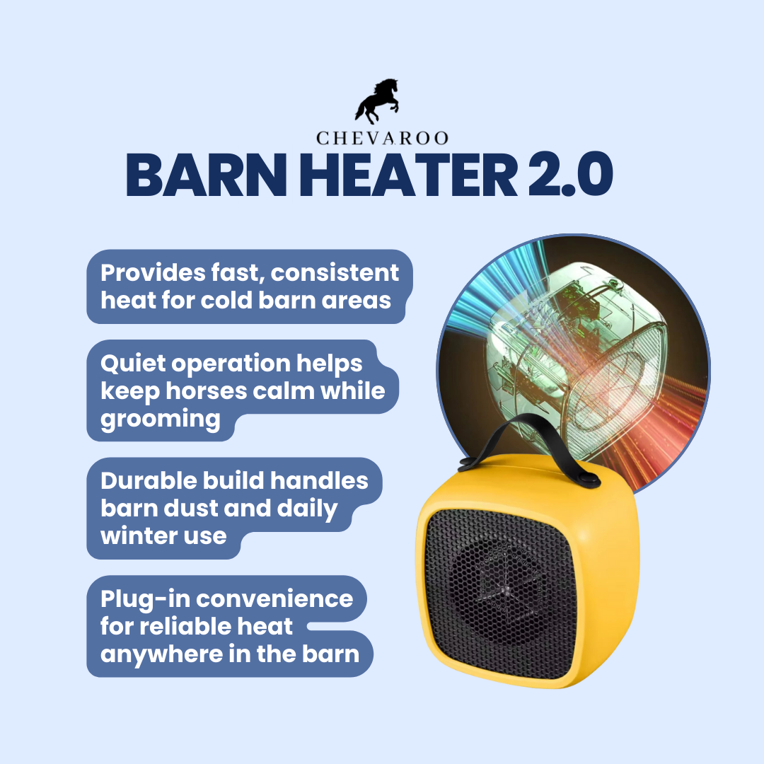 The Chevaroo Barn Heater 2.0 is a compact yet powerful heating solution designed to keep your horse’s stall, grooming area, or tack room warm during cold seasons. Built with fast-heating PTC ceramic technology, this unit provides safe, efficient warmth without loud noise or high energy consumption. Its small size makes it ideal for placing near grooming stations, foaling areas, indoor wash racks, or your tack trunk to keep equipment warm and prevent freezing temperatures from affecting your routine.