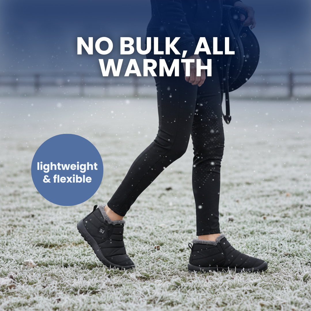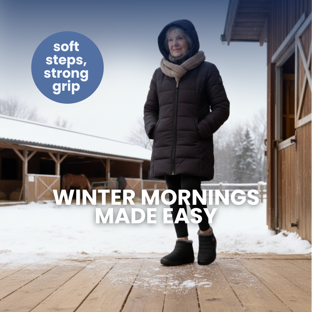 Key Features 🥾 Slim Ankle Design: Moves easily in stirrups and doesn’t bulk under breeches 💧 Waterproof Protection: Keeps feet dry in snow, mud & winter slush 🧸 Plush Inner Lining: Short-plush insulation for steady warmth in cold barns 🧍Lightweight & Flexible: Comfortable for hours of ground work or riding prep 🦶 Non-Slip Rubber Sole: Safe traction on wet cement, mats, or frozen ground