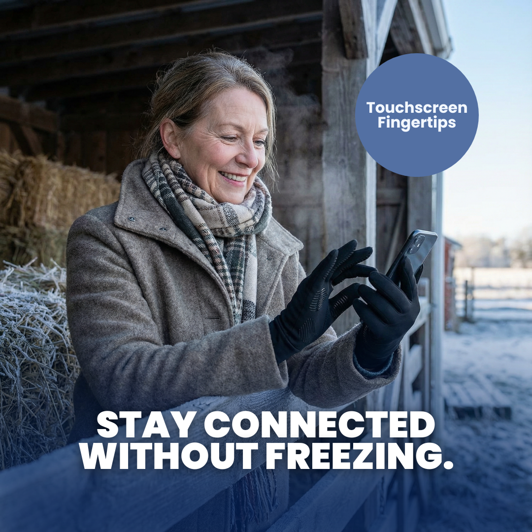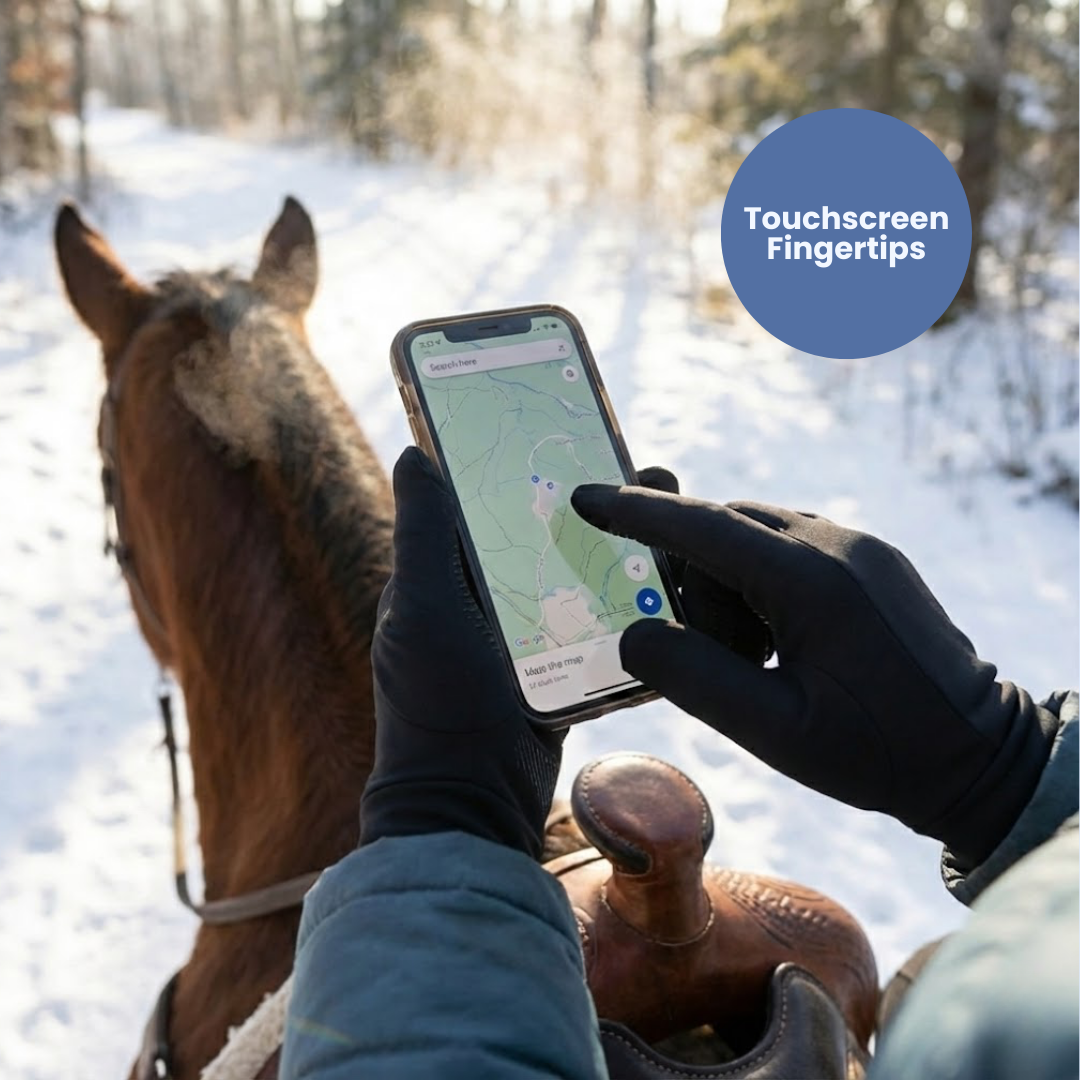 Made from lightweight polyester with a plush inner lining, they keep your fingers flexible and insulated while long wrist cuffs help lock in heat. Touchscreen-ready fingertips let you answer calls or scroll without removing your gloves, while anti-slip silicone patterns on the palms improve grip on reins, buckets, grooming tools, handlebars, or anything you hold in freezing weather.