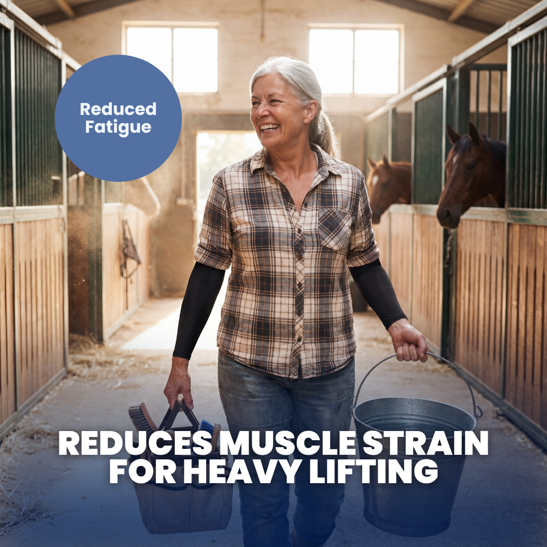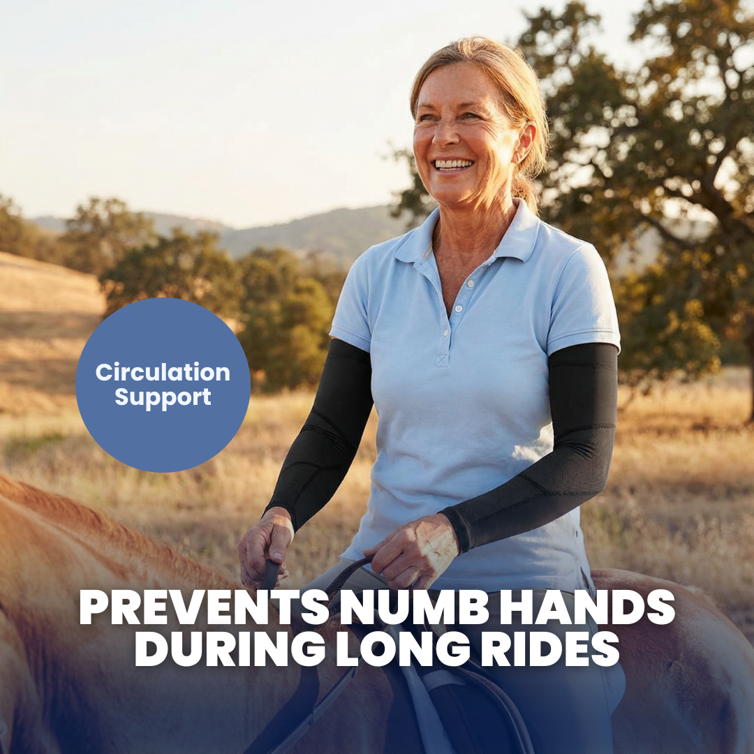 Benefits 🐴 Helps Prevent Numb Hands: Supports circulation when holding reins or tools for extended periods 💪 Reduces Muscle Fatigue: Compression helps arms feel fresher during long barn days 🌞 Protects Skin & Enhances Comfort: Combines sun protection with cooling, breathable fabric