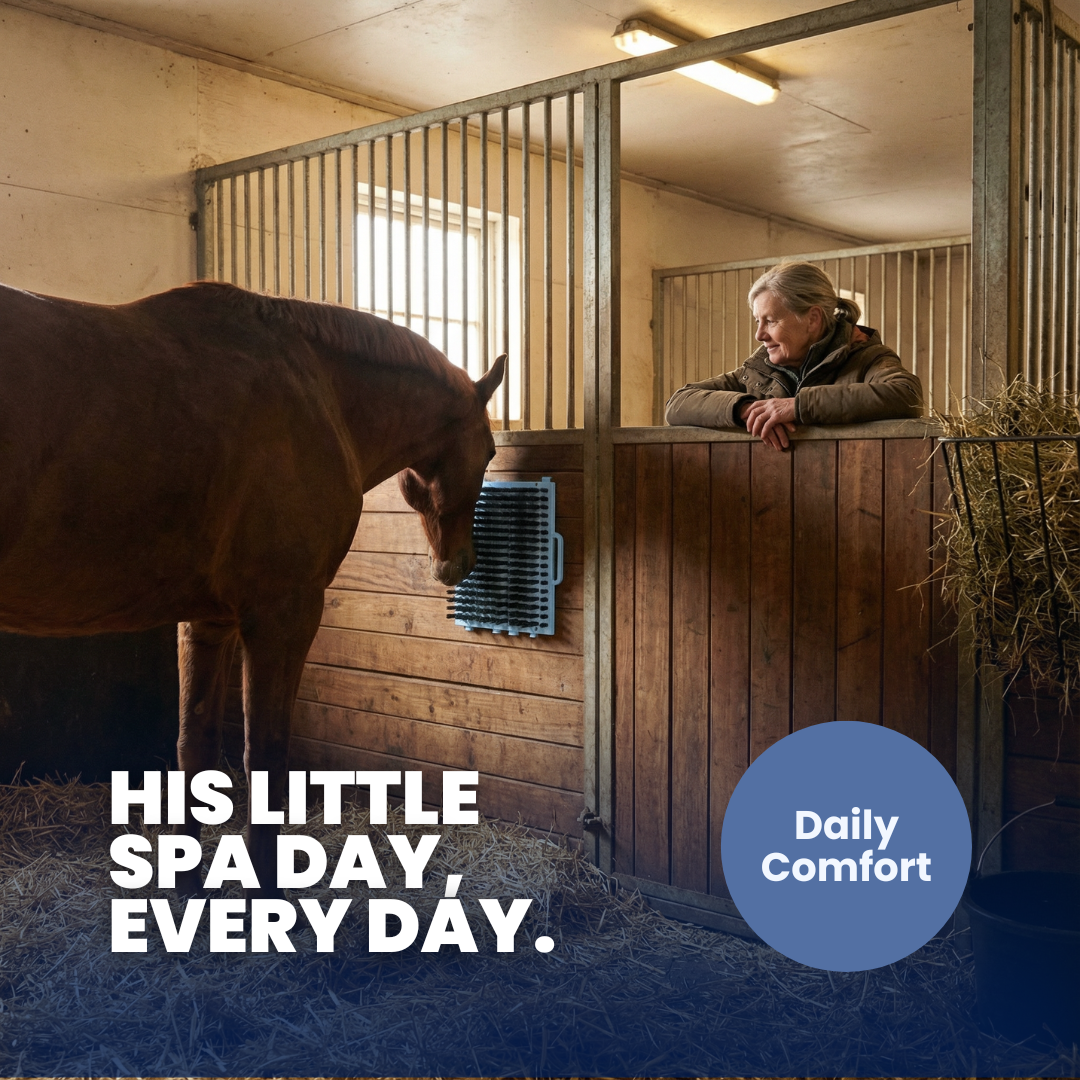 Benefits ✨ Promotes Healthier Skin & Coat: Reduces itchiness and buildup while supporting natural shedding. 🧘 Encourages Natural Behavior: Gives horses a safe outlet for scratching without damaging fences or stalls. ⏱️ Saves Grooming Time: Keeps coats cleaner between full grooming sessions, especially in busy barns.